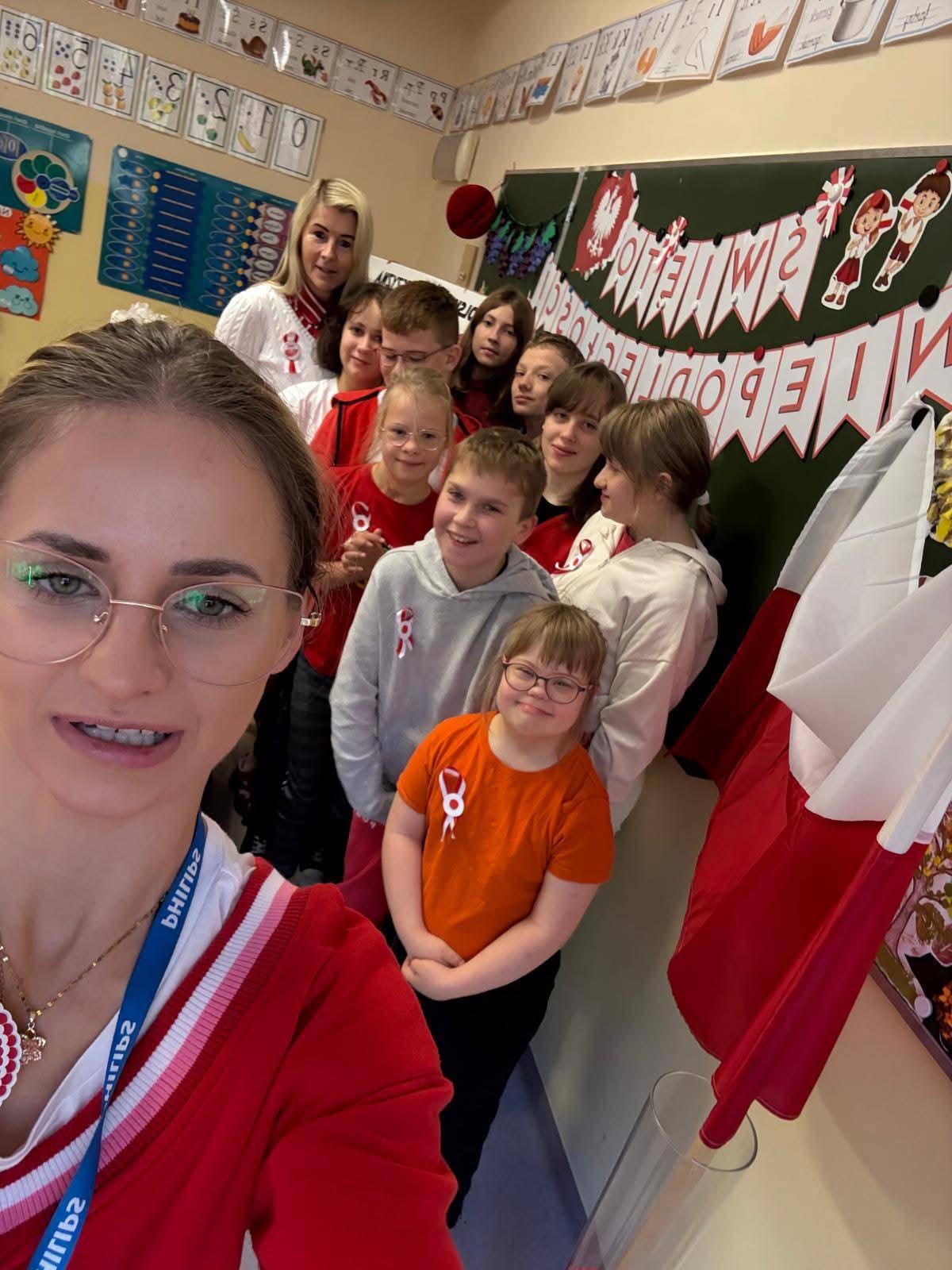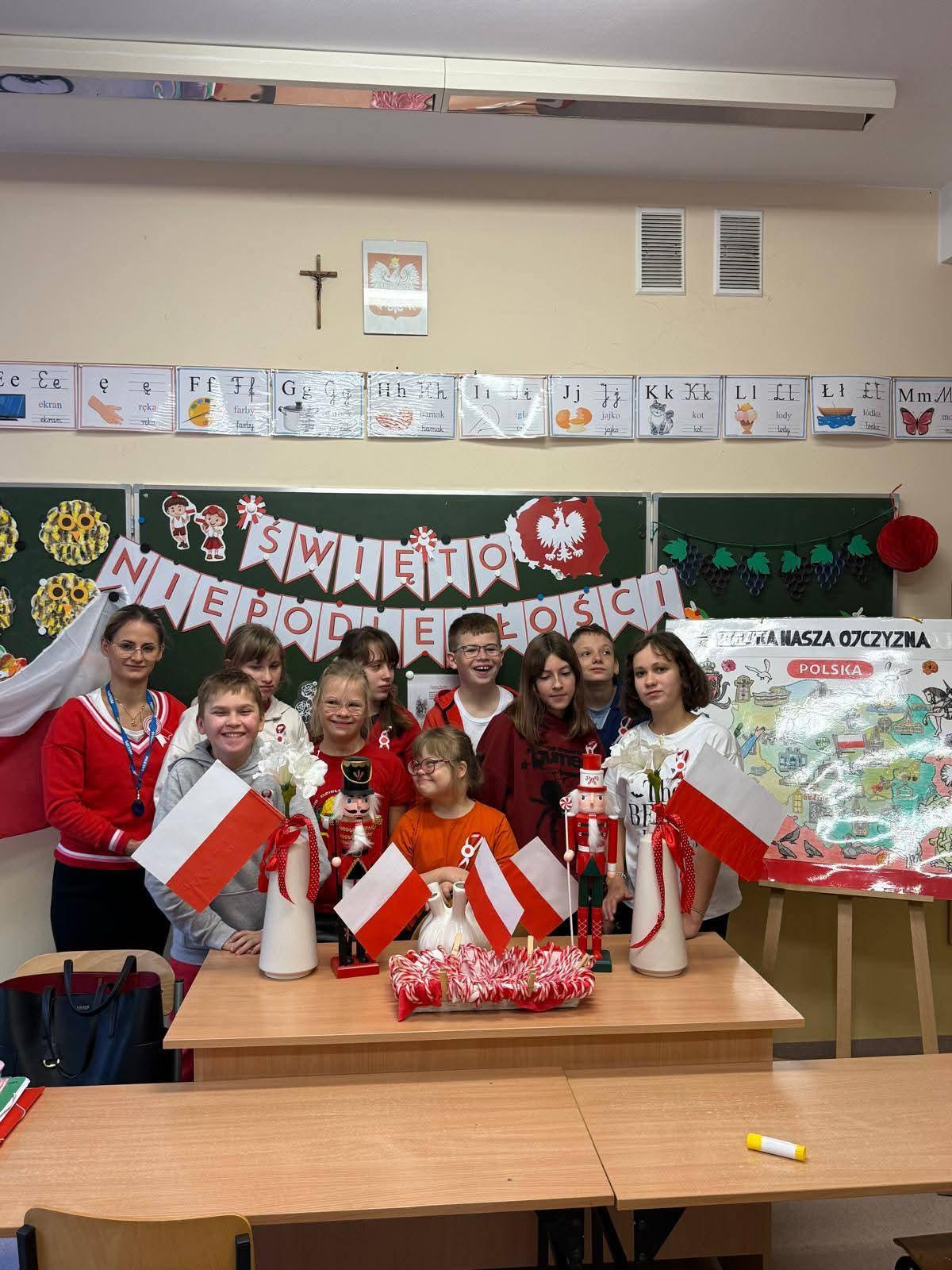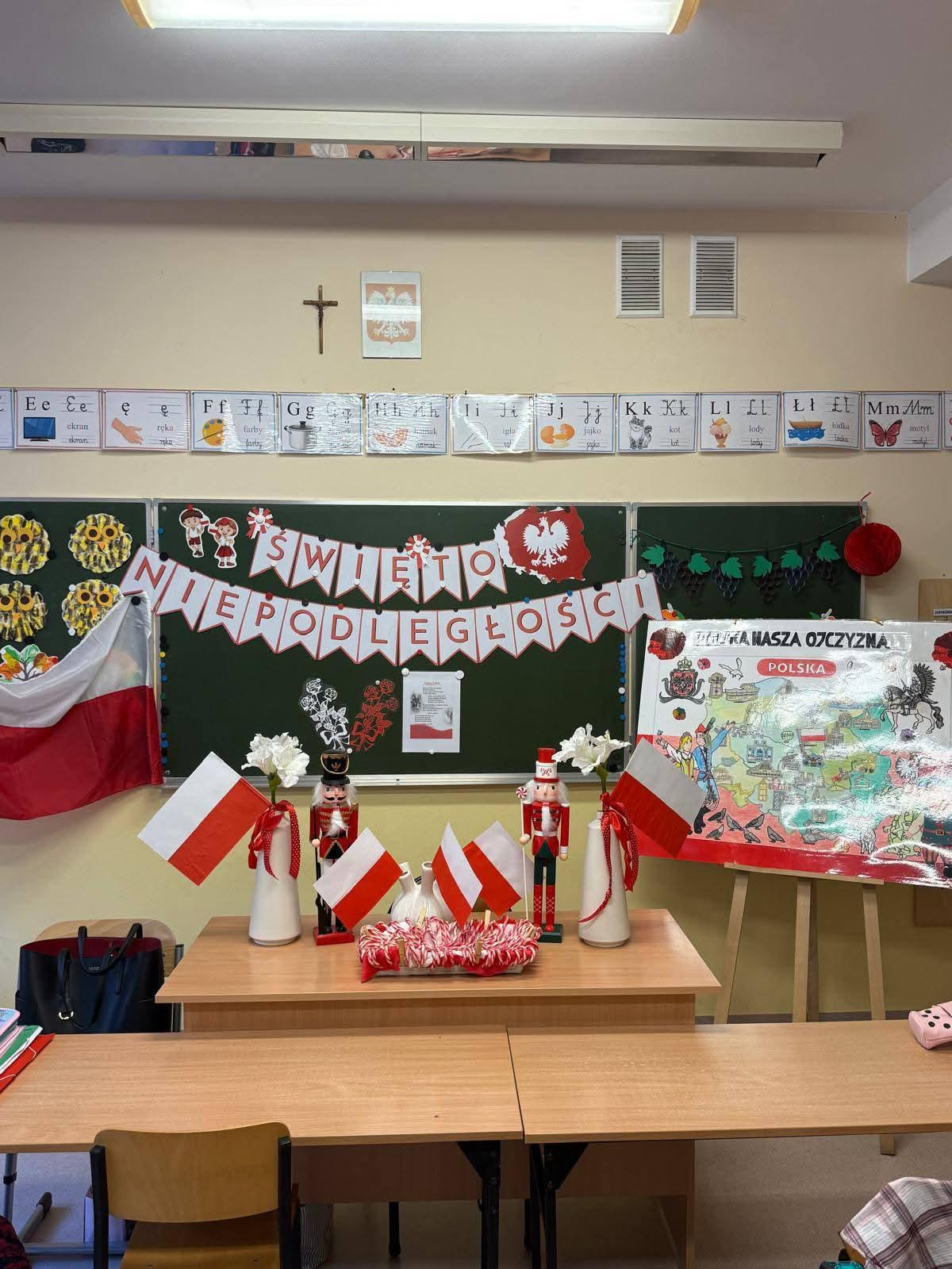 Na szkolnych korytarzach i w klasach pojawiły się biało-czerwone dekoracje i symbole narodowe.