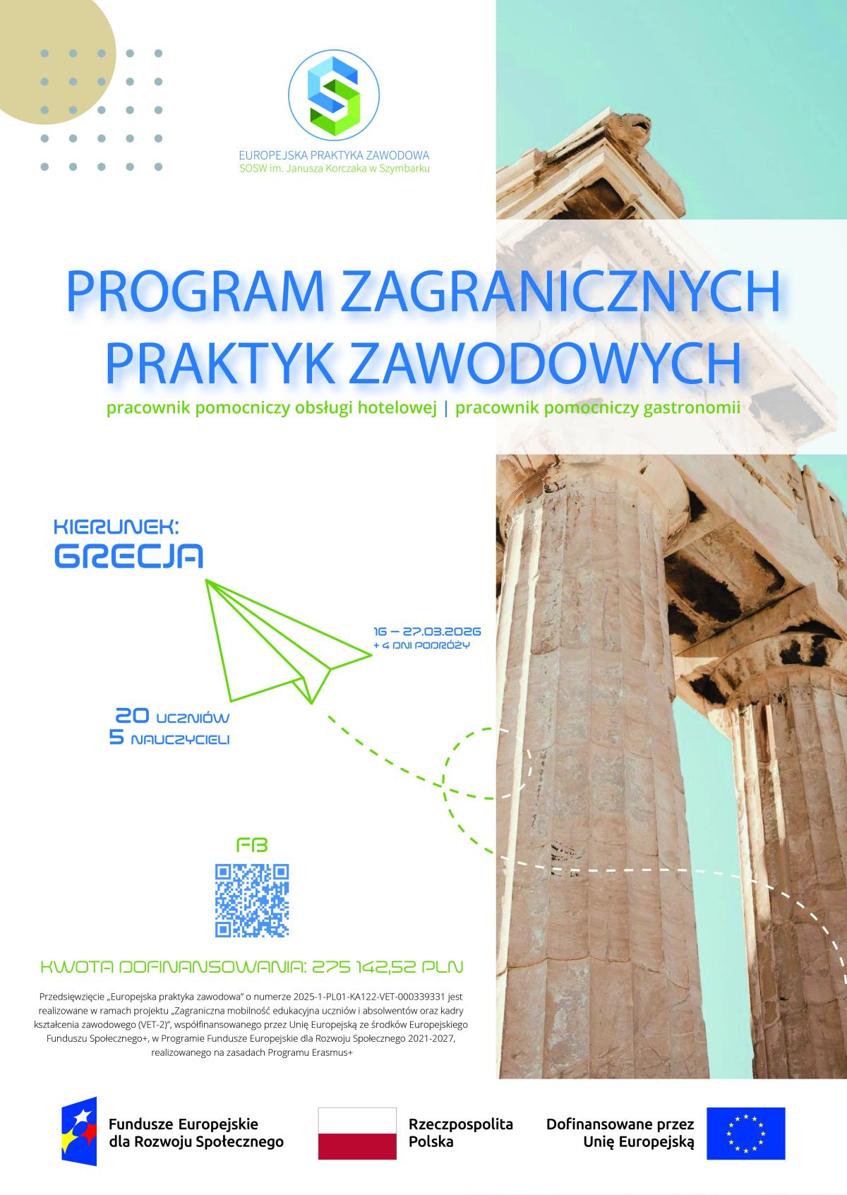 Projekt o numerze 2025-1-PL01-KA122-VET-000339331, współfinansowany ze środków Europejskiego Funduszu Społecznego+ w ramach Programu Fundusze Europejskie dla Rozwoju Społecznego 2021–2027, umożliwi 20 uczniom kształcącym się w zawodach pracownik pomocniczy obsługi hotelowej oraz pracownik pomocniczy gastronomii udział w zagranicznych praktykach zawodowych w Grecji.
