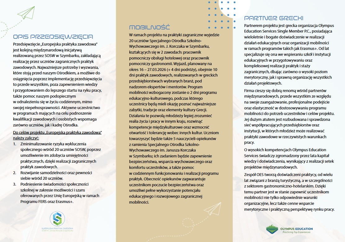 Zapraszamy do zapoznania się z ulotką i plakatem dotyczącymi przedsięwzięcia „Europejska praktyka zawodowa”, realizowanego przez Specjalny Ośrodek Szkolno-Wychowawczy im. Janusza Korczaka w Szymbarku.