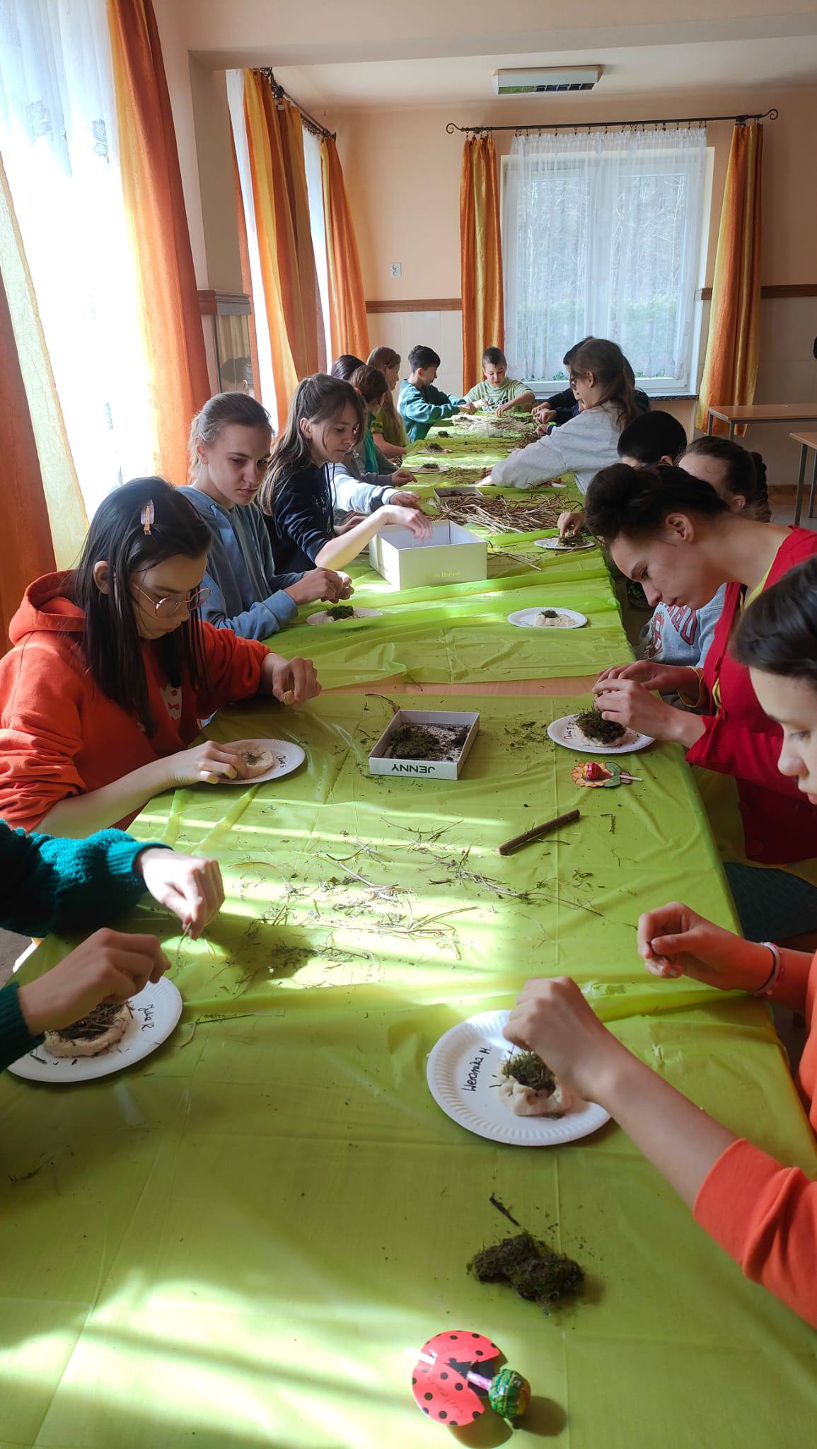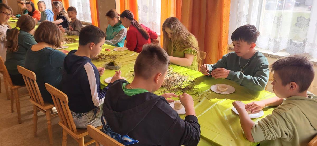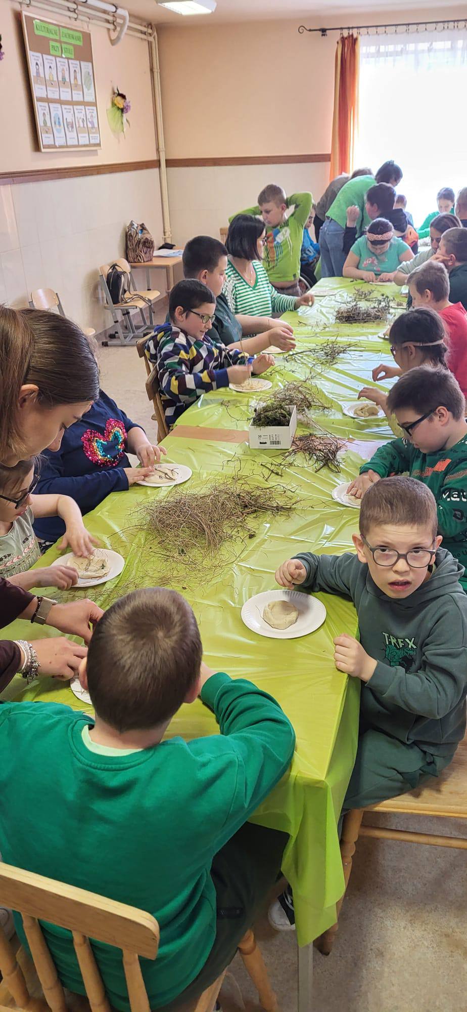Uczniowie samodzielnie uwili gniazda z różnych materiałów.
