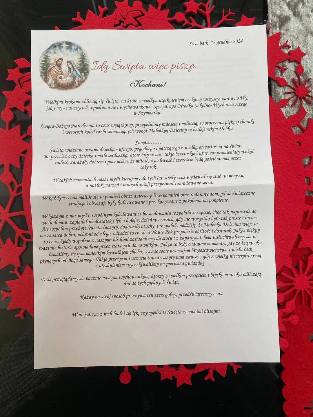 Święta Bożego Narodzenia to czas, kiedy szczególnie odczuwamy potrzebę bliskości i wsparcia, dlatego w tym roku nasz Ośrodek przystąpił do akcji "Idą Święta, więc piszę..." organizowanej przez Hospicjum im. Chrystusa Króla w Stróżach.